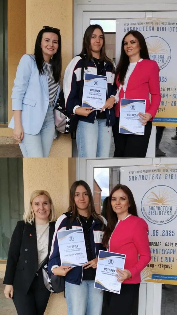 На 24.Републички натпревар „Млади библиотекари“, оргазнизиран од Библиотекарско здружение на Македонија, којшто се одржа на 09.05.2025 година во просториите на НУЦК „Кочо Рацин“ – Кичево, нашата претставничка која освои прво место на локално ниво Анастасија Арсовска, од ООУ “Кочо Рацин” -Куманово, имаше успешно учество и солидни резултати. Натпреварот е со цел популаризација на библиотеката и библиотечниот материјал. Честитки за вложениот труд, посветеност и успеси во иднина.