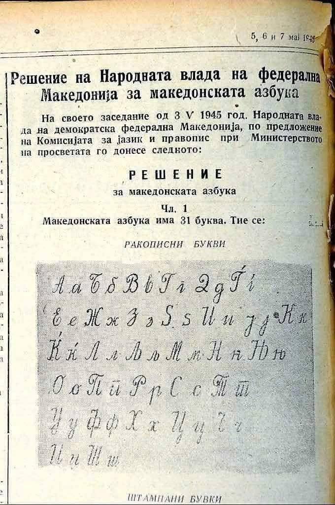 80 години од кодификацијата на македонскиот стандарден јазик. На 3 мај 1945 г. со Решение на Народната влада на Федерална Македонија е усвоена азбуката на македонскиот јазик врз принципот еден глас – една буква, азбука којашто исто така се надоврзува на претходната писмена традиција – црковнословенската кирилица, реформираната кирилица, како и графискиот систем што го користи Мисирков.